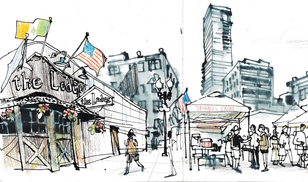 A shorter sketchbook I used on my July travels between Kaukauna (Wisconsin), Chicago, and Edmonds (Washington). I used a lot of watersoluble ink and colored pencil in this one.